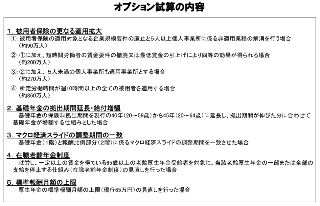財政検証の報告では、現行制度に基づく「財政の現況及び見通し」に加えて、一定の制度改正を仮定した「オプション試算」が実施されます。