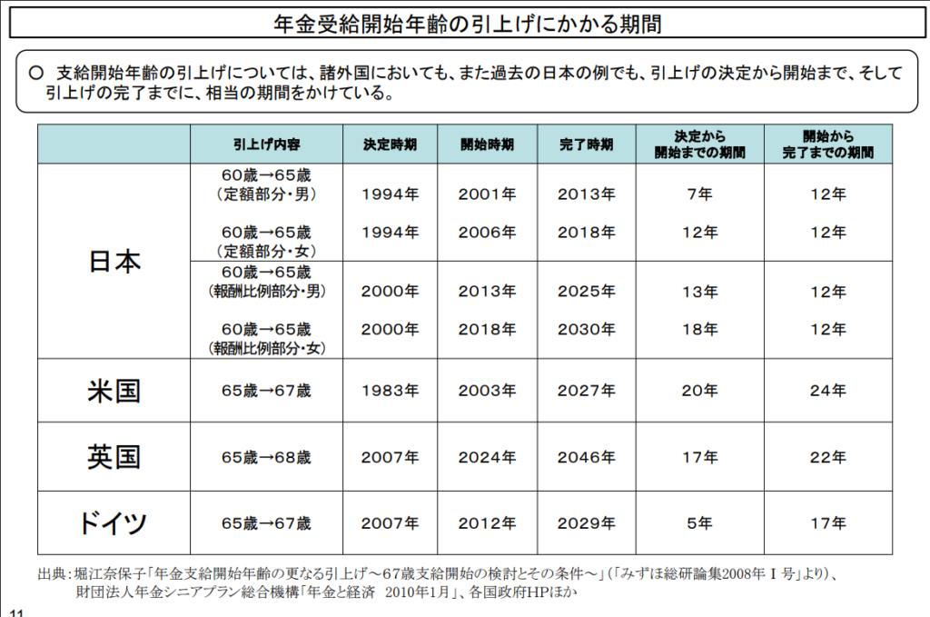 - 過去の支給開始年齢の引き上げは長い期間をかけて検討し、決定から実施までにもある程度の期間をおき、実施は段階的に行われた。