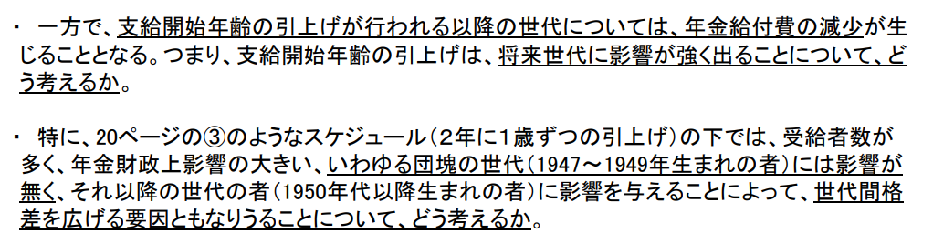 支給開始年齢の引き上げは、ある世代を区切ってそこから下の世代の年金給付にマイナスの影響が生じるので、世代間格差を広げることになってしまいます。